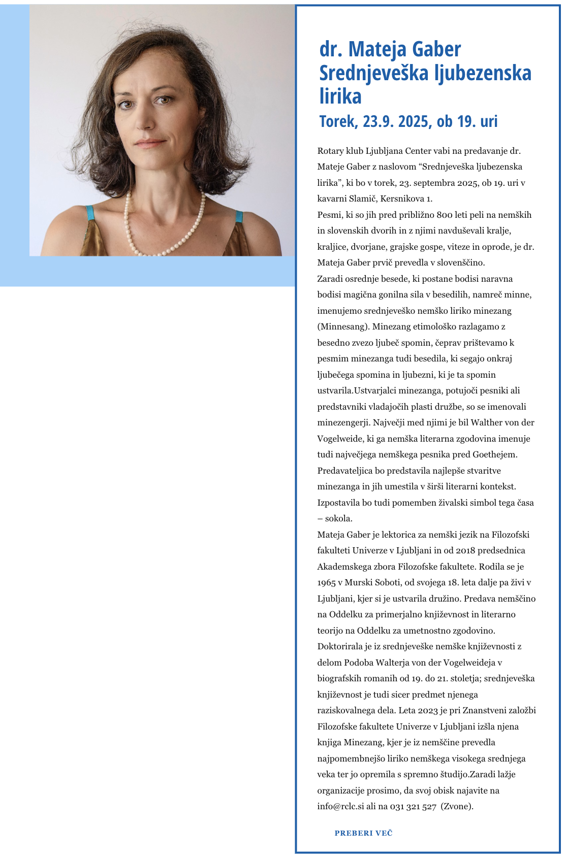Rotary klub Ljubljana Center vas vabi, da se nam pridružite v torek 21. maja ob 19. uri v kavarni Slamič, Kersnikova 1 na svečanosti ob podelitvi enkratnih štipendij 5 študentkam in študentom Akademije za glasbo iz naslova mednarodnega glasbenega projekta Mladi talenti.